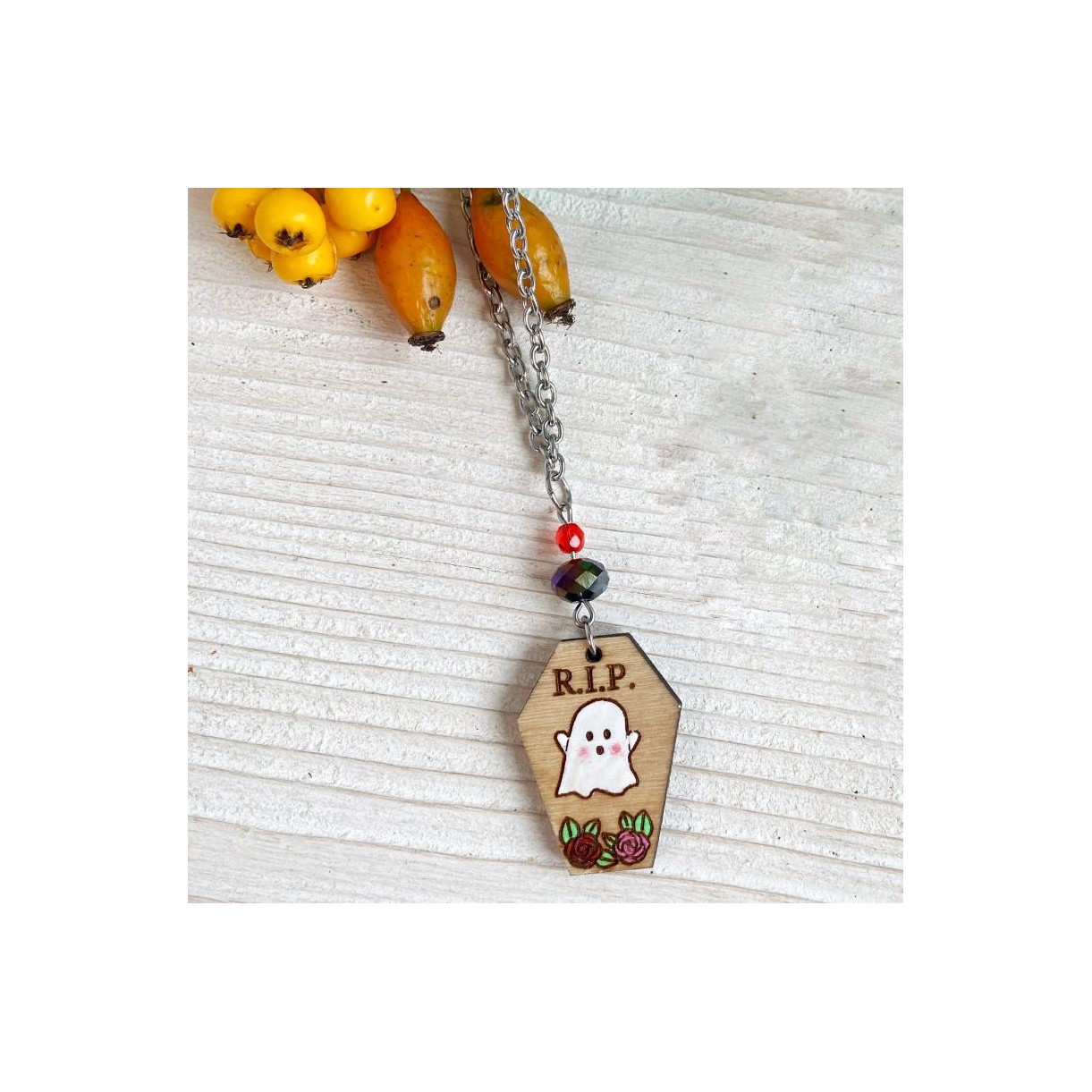 Puoi indossare la nostra collana con Bara e Fantasma, in legno dipinto a mano, realizzata in esclusiva da Daffodil, così ti sentirai unica!