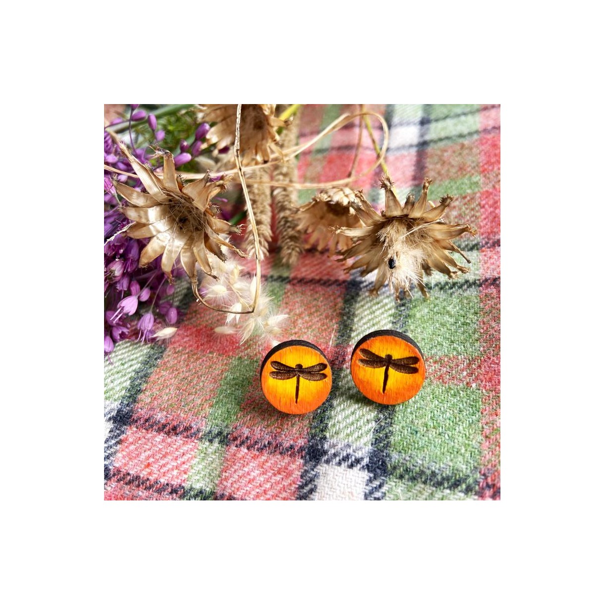 Realizzati in legno FSC, sono dipinti a mano con una libellula sospesa in toni caldi ambrati, come se fosse intrappolata in una goccia di resina del tempo.