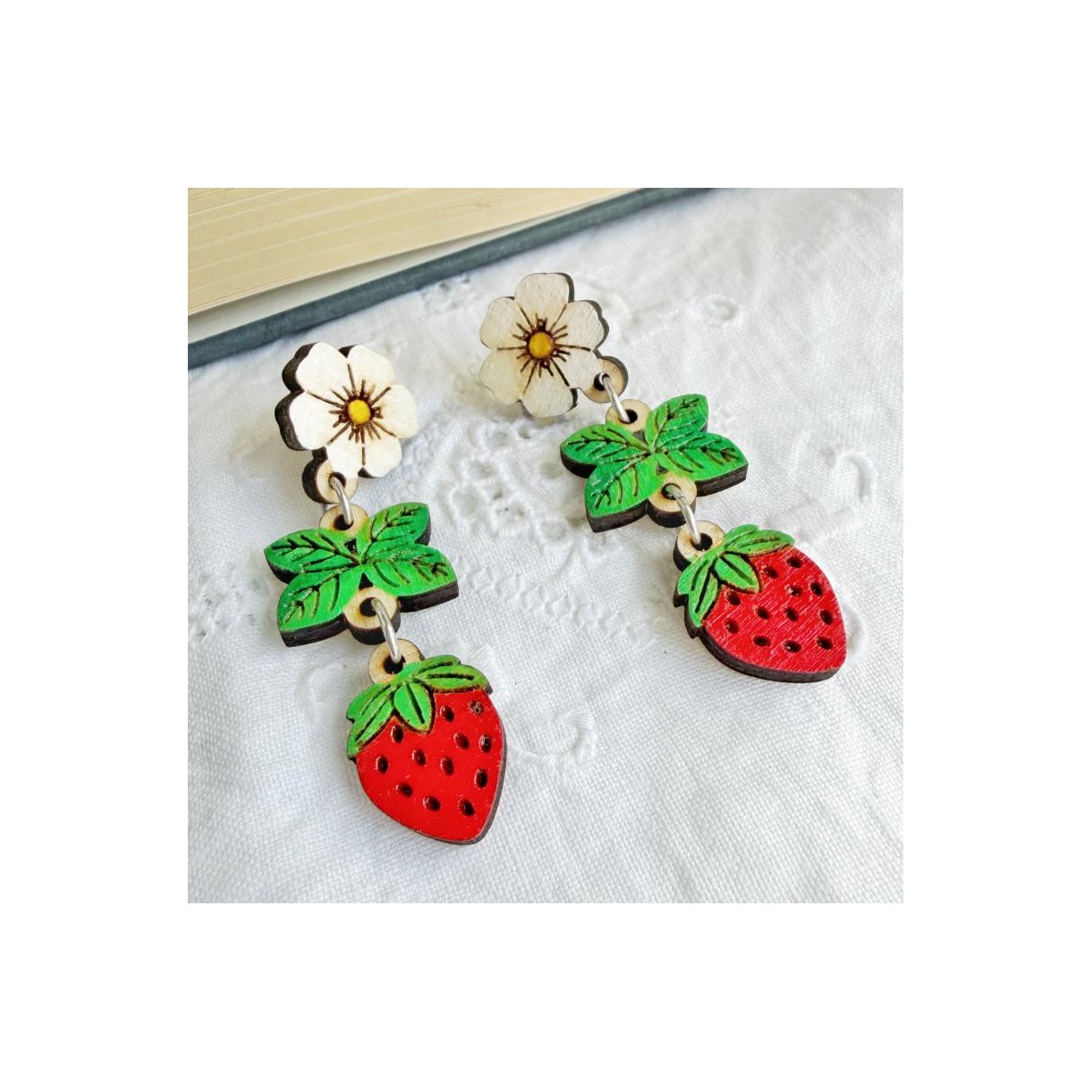 Coppia di orecchini in legno di pregio certificato. Il perno a lobo è formato da fiori di fragola dipinti a mano nei toni del bianco e subito sotto dei ciuffi di foglie verde foresta. Terminano gli orecchini due fragoline mature e succose, dipinte con un rosso vibrante.